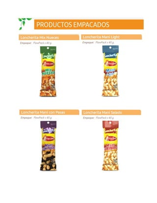 El documento describe cuatro tipos de maní: maní sin sal, maní salado, maní light y maní dulce. Todos provienen principalmente de China, Argentina, EE. UU. y Nicaragua y son altamente ricos en proteínas, pero cada uno está dirigido a grupos específicos según sus características de sal, grasa o dulzura.