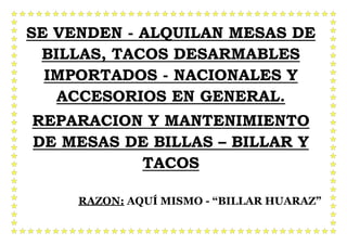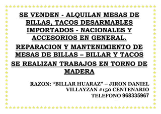 Este anuncio clasificado ofrece la venta y alquiler de mesas de billar, tacos desarmables importados y nacionales, y accesorios. También se ofrecen servicios de reparación y mantenimiento de mesas de billar y tacos. Se encuentra ubicado en el Jirón Daniel Villayzan #150 en Centenario.