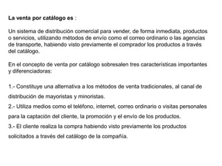 La venta por catálogo permite a los clientes ver productos a través de catálogos y realizar compras por correo o transporte. Benjamin Franklin creó uno de los primeros catálogos en 1744 para vender libros. Con el tiempo, los sitios web reemplazaron a los catálogos impresos como principal método de compra. Los catálogos tienen ventajas como permitir a los clientes ver detalles de productos, pero también tienen desventajas como necesitar inventario y distribución física.