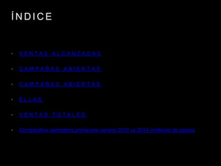 Este resumen de ventas describe los resultados de ventas de Privialia México S.A. de C.V. para el semestre primavera-verano de 2014. A pesar de la recesión económica, lograron alcanzar 339 millones de pesos en ventas, aunque menos que los 402 millones del año anterior. La campaña Ellas representó casi la mitad de las ventas del semestre. Las ventas totales fueron mayores en enero, febrero y marzo en comparación con el mismo periodo del año pasado.
