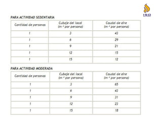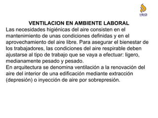 El documento trata sobre la ventilación en ambientes laborales. Explica que la ventilación es el movimiento de aire en espacios cerrados producido por su circulación o desplazamiento. Detalla diferentes tipos de ventilación como forzada y natural, y métodos como la ducha de aire y cortinas de aire. También describe recomendaciones técnicas para la ventilación y posibles consecuencias para la salud de los trabajadores si la ventilación es inadecuada.