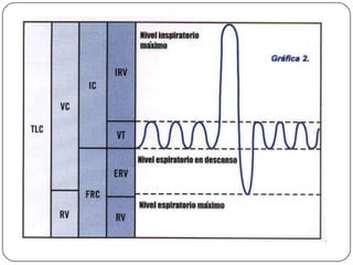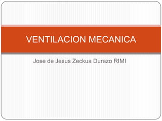 El documento describe la anatomía y fisiología básica del sistema respiratorio, incluyendo las vías aéreas, los pulmones, y los conceptos clave de la ventilación pulmonar y el intercambio gaseoso. Luego explica los objetivos, indicaciones y componentes básicos de la ventilación mecánica, así como las modalidades como la ventilación controlada, asistida-controlada e intermitente mandatoria. Finalmente, cubre técnicas como el soporte de presión continua en la vía aérea y la ventilación con