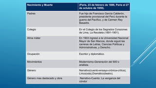 Ventura García Calderón fue un escritor y diplomático peruano del siglo XX conocido por su cuento "La venganza del cóndor". Nació en París en 1886 y se educó en Lima. Fue una figura prominente del modernismo hispanoamericano. Su cuento más famoso cuenta la historia de un indígena maltratado que guía al narrador y luego orquesta la venganza de los cóndores contra su abusivo amo, el Capitán Gonzales.