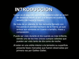 Venus es el segundo planeta más cercano al Sol. Es similar a la Tierra en tamaño, masa y composición, pero su atmósfera densa de dióxido de carbono genera un efecto invernadero que calienta la superficie a más de 480°C. Venus gira al revés que la Tierra y su año dura 225 días terrestres. Debido a su proximidad a la Tierra, ha sido estudiado por numerosas sondas espaciales como Venus Express.