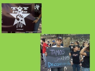 El documento describe la situación social actual de los jóvenes dominicanos debido a la falta de oportunidades, lo que ha despertado nuevas corrientes de protestas sociales y opositoras. Las protestas no solo son de carácter político, sino que buscan mejorar el país en todos los sentidos. Los jóvenes quieren participar más allá de ser parte del problema y proponen soluciones que aumenten las oportunidades justas y equitativas para todos en el país.