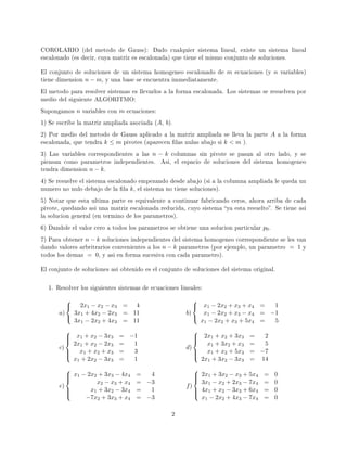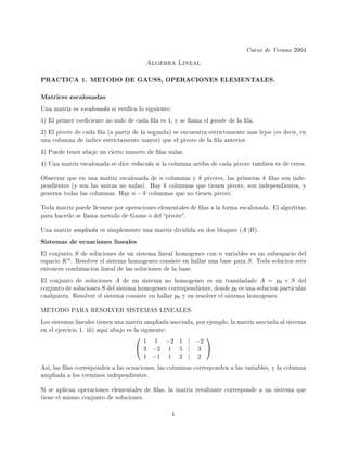 Este documento presenta conceptos clave sobre matrices escalonadas y el método de Gauss para resolver sistemas de ecuaciones lineales. Explica que una matriz escalonada tiene 1s en la diagonal principal y ceros arriba, y que el método de Gauss lleva cualquier matriz a forma escalonada mediante operaciones elementales de filas. También describe el algoritmo de 7 pasos para resolver sistemas usando esta forma escalonada.