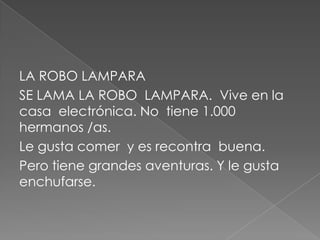 La Robo Lampara vive en una casa electrónica con sus aventuras. Un día, se encontró con Baldi Gato, Airepulpo y Jarrigato su amigo, así como con otros objetos como Jarridestructor, Baldimicrofono y Aireletra. Juntos fueron a la casa de la Robo Lampara para jugar a los autitos, Minicraft y en un pelotero.
