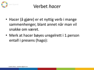El documento proporciona información sobre el verbo "hacer" en español. Explica que "hacer" significa "hacer" o "hacer" en noruego y se usa comúnmente para hablar sobre el clima. Además, detalla la conjugación irregular del verbo "hacer" en primera persona del singular en presente (yo hago) y proporciona ejemplos de su conjugación en otras personas.