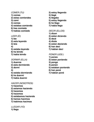 El documento presenta las conjugaciones de varios verbos en español (comer, leer, dormir, hacer, decir, poner, llegar) en diferentes tiempos verbales, incluyendo el presente, pasado, futuro, condicional e imperfecto. Se proporcionan las formas para la primera, segunda y tercera persona singular y plural.
