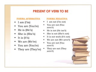 Este documento proporciona información sobre el verbo "to be" en inglés en presente. Explica las formas afirmativa, negativa e interrogativa del verbo y ofrece ejemplos. También destaca algunos usos especiales como expresar la edad, las sensaciones y el tiempo atmosférico, así como otras expresiones comunes con "to be".
