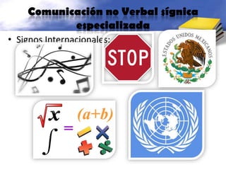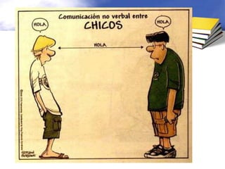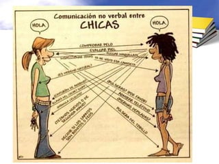 La comunicación no verbal incluye gestos, lenguaje corporal, distancia entre personas, vestimenta y música. La comunicación no verbal transmite mensajes sobre las emociones e intenciones de una persona sin usar palabras. Los gestos pueden ser emblemáticos, ilustrativos, patógrafos o reguladores, y cada cultura tiene sus propias convenciones para interpretar los gestos y la comunicación no verbal.