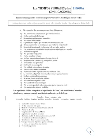 Este documento presenta varios ejercicios gramaticales que involucran el uso de sinónimos y verbos en contexto. Los ejercicios incluyen identificar sinónimos de verbos que significan "cambiar", completar oraciones sustituyendo "no + verbo" por verbos alternativos, y reemplazar "hacer + infinitivo" por verbos individuales. El objetivo es practicar el uso apropiado de verbos en diferentes contextos gramaticales.