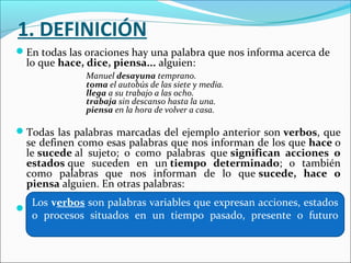 Este documento define los verbos y explica sus componentes principales como la raíz, las desinencias, la persona, el número, el tiempo y el modo. Además, describe la conjugación verbal, los diferentes tiempos verbales (simples, compuestos, perfectos e imperfectos), los verbos regulares e irregulares, y defectivos. Por último, explica el uso común de los tiempos verbales como el presente, pretérito, futuro y subjuntivo, así como el imperativo.