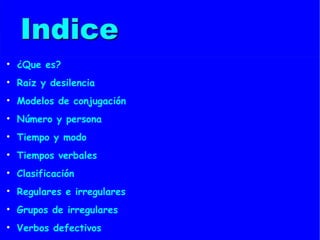 Este documento explica los conceptos básicos de la conjugación verbal en español. Explica que los verbos expresan acciones y tienen diferentes formas según el tiempo, modo, número y persona. Detalla que las formas verbales se derivan de la raíz del verbo mediante la adición de desinencias que varían según la conjugación (-ar, -er, -ir). También clasifica los verbos en regulares e irregulares y menciona la existencia de verbos defectivos.