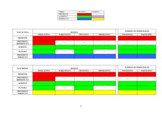 1. El documento explica la formación de los verbos regulares griegos a partir de sus temas verbales en las voces activa, media y pasiva. Se describen los temas verbales de presente, aoristo y perfecto y cómo se forman las distintas formas verbales a partir de ellos mediante la adición de desinencias.