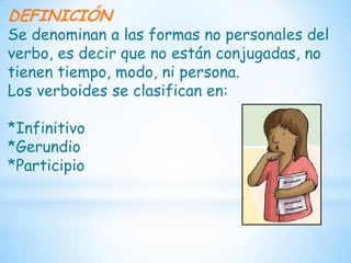 Este documento define y clasifica las formas no personales del verbo, conocidas como verboides. Explica que los verboides incluyen el infinitivo, gerundio y participio. Define el infinitivo como una palabra conjugable terminada en ar, er o ir que puede funcionar como sustantivo. Define el gerundio como una forma verbal que demuestra una acción sin especificar el tiempo, modo, número o persona. Finalmente, define el participio como una forma del verbo que funciona como adjetivo sin perder completamente su naturaleza verbal.