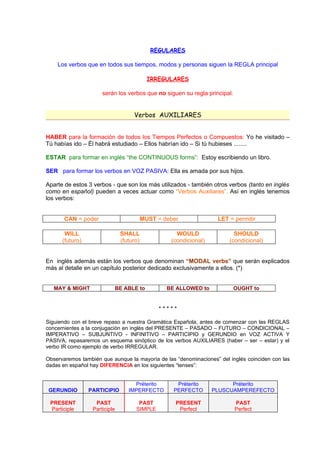 El documento proporciona una guía sobre los verbos en español. Explica las partes de un verbo, incluida la raíz y la desinencia. También describe diferentes tipos de verbos como transitivos, intransitivos, reflexivos, recíprocos y unipersonales. Además, cubre verbos regulares e irregulares y verbos auxiliares como haber, ser y estar.
