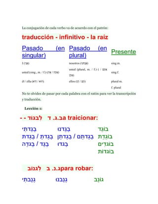Lección 1-4 presentan las conjugaciones de verbos como engañar, aprender, pensar y huir. Lección 5-8 explican verbos como escribir, vender, bailar y olvidar. Lección 9-11 describen verbos como desear, construir, subir y enfermarse. Finalmente, lección 12-14 cubren verbos como vivir, volar y moverse. El documento también incluye las traducciones e instrucciones para ver los detalles
