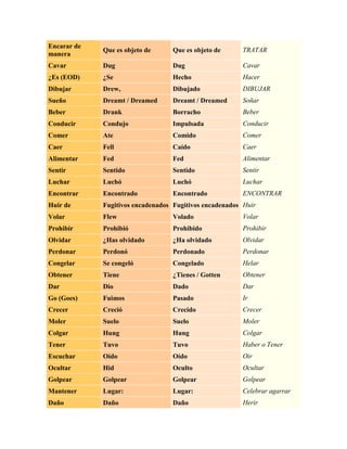 Este documento proporciona las formas del infinitivo, pasado simple y participio pasado de más de 50 verbos en inglés y su traducción al español. Incluye verbos comunes como surgir, despertar, ser, comenzar, comprar, encontrar, beber, conducir, comer y más.