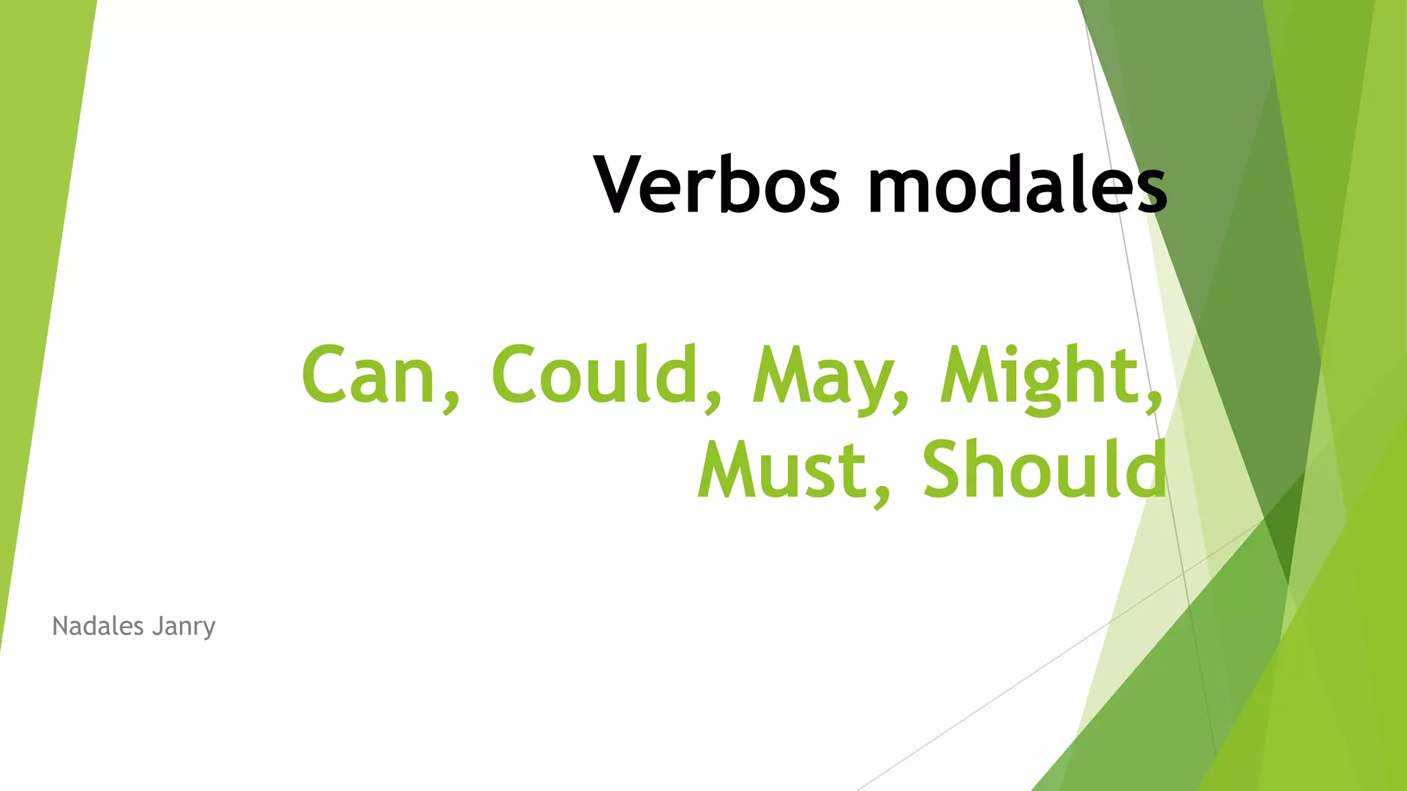 Este documento describe los verbos modales en inglés, incluyendo can, could, may, might, must y should. Explica que estos verbos se usan para expresar modalidad como probabilidad, habilidad, permiso u obligación. Además, carecen de la "s" en la tercera persona del presente, funcionan como verbos auxiliares en preguntas y no cambian de tiempo ni se separan de otros verbos con la partícula "to". Luego, detalla los significados y usos específicos de cada verbo modal.