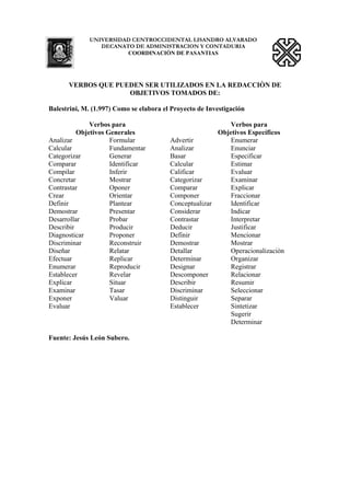 Este documento presenta varios tipos de verbos y conectores que pueden ser utilizados para la redacción de objetivos e informes de investigación. Incluye listas de verbos para objetivos generales y específicos, así como verbos que identifican diferentes tipos de investigación. También proporciona conectores y relacionantes que pueden usarse para enlazar oraciones y párrafos.
