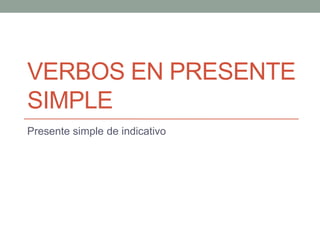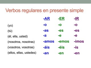 Este documento presenta las conjugaciones de los verbos regulares en presente simple en español. Explica las terminaciones para cada persona en los verbos que terminan en -AR, -ER e -IR para la primera, segunda y tercera persona del singular y plural. Además, proporciona ejemplos de verbos regulares para cada categoría.