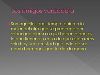 Este documento describe las características de una verdadera amistad. Una amistad verdadera se caracteriza por preocuparse por el bienestar del otro, brindar apoyo y ayuda incondicional, y hacer reír al otro incluso cuando está triste. Los amigos verdaderos siempre están presentes y se preocupan por el otro como si fuera familia.