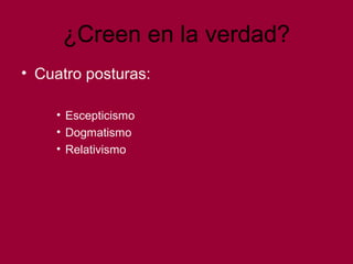 Este documento explora diferentes posturas sobre la verdad: relativismo, dogmatismo y realismo. Discute las consecuencias de cada postura para el conocimiento, la persona y los demás. Concluye que la verdad se fundamenta en la realidad objetiva de las cosas, no en la subjetividad de cada persona. Aunque las interpretaciones pueden variar, la realidad es independiente de las opiniones.