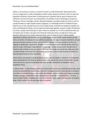 Este documento narra la historia de un joven estudiante de derecho que sufre de esquizofrenia y paranoia. Conoce y se enamora de una chica, pero durante una tormenta tiene una pesadilla en la que la mata. Al despertar, descubre que su pesadilla se hizo realidad. A partir de entonces guarda partes de su cuerpo en el refrigerador, creyendo que de esta forma podrán estar juntos para siempre. Dos meses después decide que está enamorado de otra chica y se despide de la cabeza de su anterior no