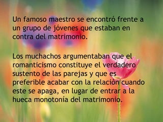 El maestro les contó a los jóvenes la historia de sus padres que estuvieron casados por 55 años. Cuando su madre falleció repentinamente, su padre la llevó rápidamente al hospital donde murió. En el funeral, su padre estaba devastado por la pérdida. Más tarde, llevó a sus hijos al cementerio donde lloró y les dijo que los 55 años que pasó con su madre fueron maravillosos y que nadie que no haya compartido su vida con alguien como ella podría entender el amor verdadero.