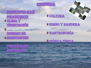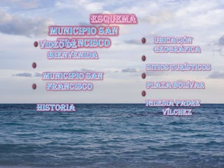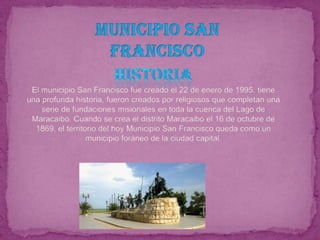 El documento proporciona información sobre el municipio de San Francisco en Venezuela. Brevemente, San Francisco se encuentra ubicado en la margen noroeste del Lago de Maracaibo. Algunos de los sitios turísticos incluyen el Parque Zoológico y la Basílica Menor. La población es de aproximadamente 418,769 habitantes y el clima es semiárido con una temperatura promedio anual de 36°C. La cultura local incluye bailes como la danza zuliana y la contradanza zuliana.