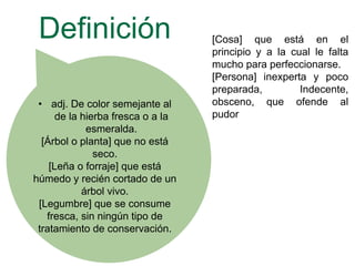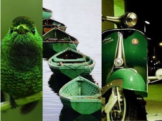 Este documento describe las propiedades y significados del color verde. Explica que el verde es un color primario en la teoría aditiva y secundario en la sustractiva. También analiza los pigmentos, longitudes de onda, contrastes y simbología del verde en la naturaleza, cultura e historia. Finalmente, resume las teorías psicológicas sobre el verde y sus atributos estéticos como un color asociado con la vida, crecimiento y renovación.