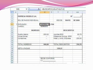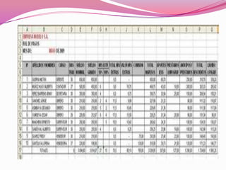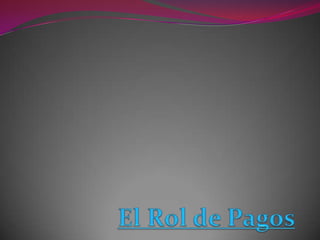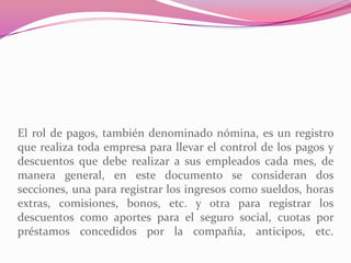 El documento describe el rol de pagos o nómina, un registro que las empresas usan para controlar los pagos y descuentos de los empleados cada mes. Contiene secciones para ingresos como sueldos y horas extras, y descuentos como aportes de seguridad social. Explica las columnas de un ejemplo de rol de pagos general y las fórmulas usadas para calcular valores. También cubre la creación de roles de pagos individuales para cada empleado.