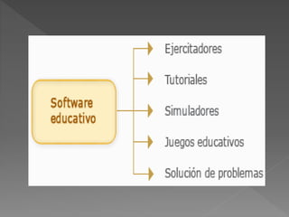 El documento habla sobre el software educativo. Explica que son programas didácticos creados para facilitar los procesos de enseñanza y aprendizaje. Sus principales características son que tienen un uso didáctico, se utilizan en ordenadores, individualizan el trabajo de cada estudiante, son interactivos y fáciles de usar. Además, propician diferentes tipos de aprendizaje y permiten la construcción de conocimientos.