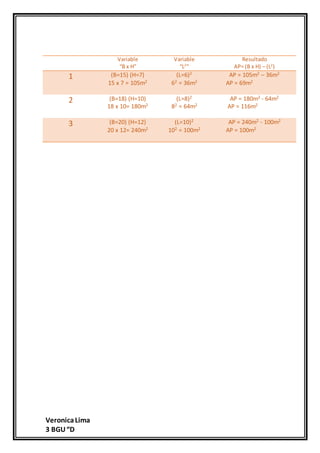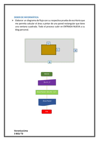El documento presenta un diagrama de flujo y prueba de escritorio para calcular el área a pintar de una pared rectangular con una ventana cuadrada. El diagrama muestra los pasos para calcular primero el área total de la pared usando la fórmula del rectángulo y luego restar el área de la ventana cuadrada para obtener el área a pintar. La prueba incluye tres ejemplos numéricos que aplican la fórmula y confirman que el proceso funciona.