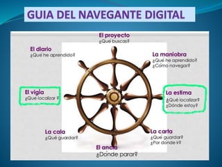 Este documento describe dos roles en la navegación digital: el Vigía, que se encarga de visualizar el objetivo de búsqueda e identificar información relevante deteniéndose a observar y leer; y la Estima, que calcula el recorrido del navegante digital anotando las etapas de búsqueda y asegurándose de que se encuentre todo lo necesario para alcanzar el objetivo.