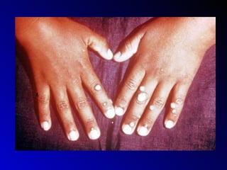 El documento describe diferentes tipos de verrugas virales, incluyendo sus causas, características y tratamientos. Las verrugas más comunes son las vulgares, planas juveniles y plantares, causadas por diferentes tipos de virus papiloma. Otras verrugas descritas son los condilomas acuminados, molusco contagioso, herpes simple y herpes zoster, con sus respectivas características clínicas y tratamientos.