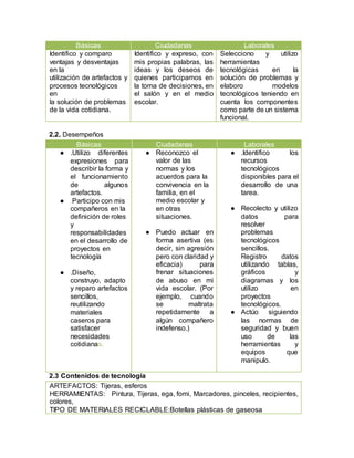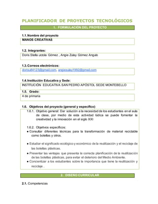Este documento presenta un proyecto tecnológico escolar cuyo objetivo general es dar solución a la necesidad de los estudiantes en el aula a través de actividades creativas que fomenten la innovación. El proyecto consiste en decorar botellas plásticas recicladas para organizar útiles escolares y concientizar sobre la importancia del reciclaje. Las actividades incluyen consultar técnicas de transformación de materiales, estudiar el significado ecológico del reciclaje y presentar las ventajas de la re