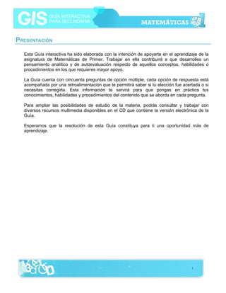Este documento presenta una guía interactiva para apoyar el aprendizaje de matemáticas de primer grado. La guía contiene 50 preguntas de opción múltiple con retroalimentación para que los estudiantes evalúen sus conocimientos. También incluye recursos multimedia adicionales y sugerencias didácticas para los maestros.