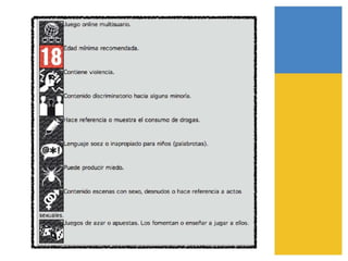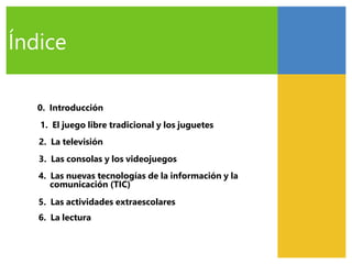 Este documento discute diversos temas relacionados con el ocio saludable para niños, incluyendo el juego libre, juguetes, televisión, videojuegos, nuevas tecnologías, actividades extraescolares y lectura. Resalta la importancia del juego para el desarrollo infantil y ofrece recomendaciones sobre un uso moderado y de calidad de la televisión, videojuegos y tecnología. También destaca la importancia de elegir actividades extraescolares que diviertan a los niños y desarrollen sus