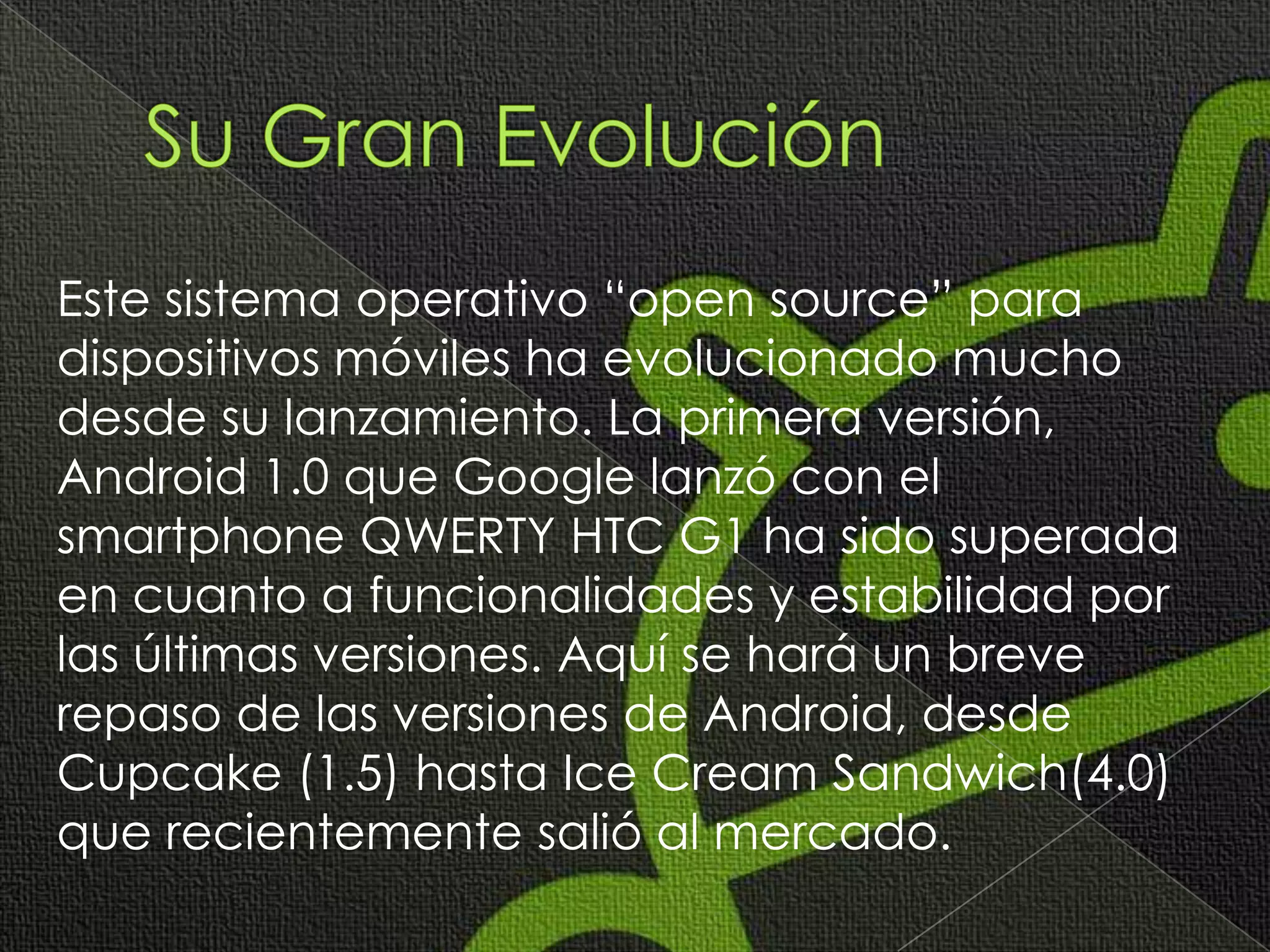Este documento resume las versiones principales de Android desde su lanzamiento en 2008 hasta Ice Cream Sandwich en 2012. Comenzó como un sistema operativo móvil basado en Linux para teléfonos inteligentes y otros dispositivos, y ha evolucionado para mejorar su estabilidad, funcionalidad y soporte para tablets. Cada versión subsiguiente agregó nuevas características como mejoras en cámaras, mapas y rendimiento. La versión más reciente, Ice Cream Sandwich, fue optimizada para funcionar en todos los tipos de dispositivos.
