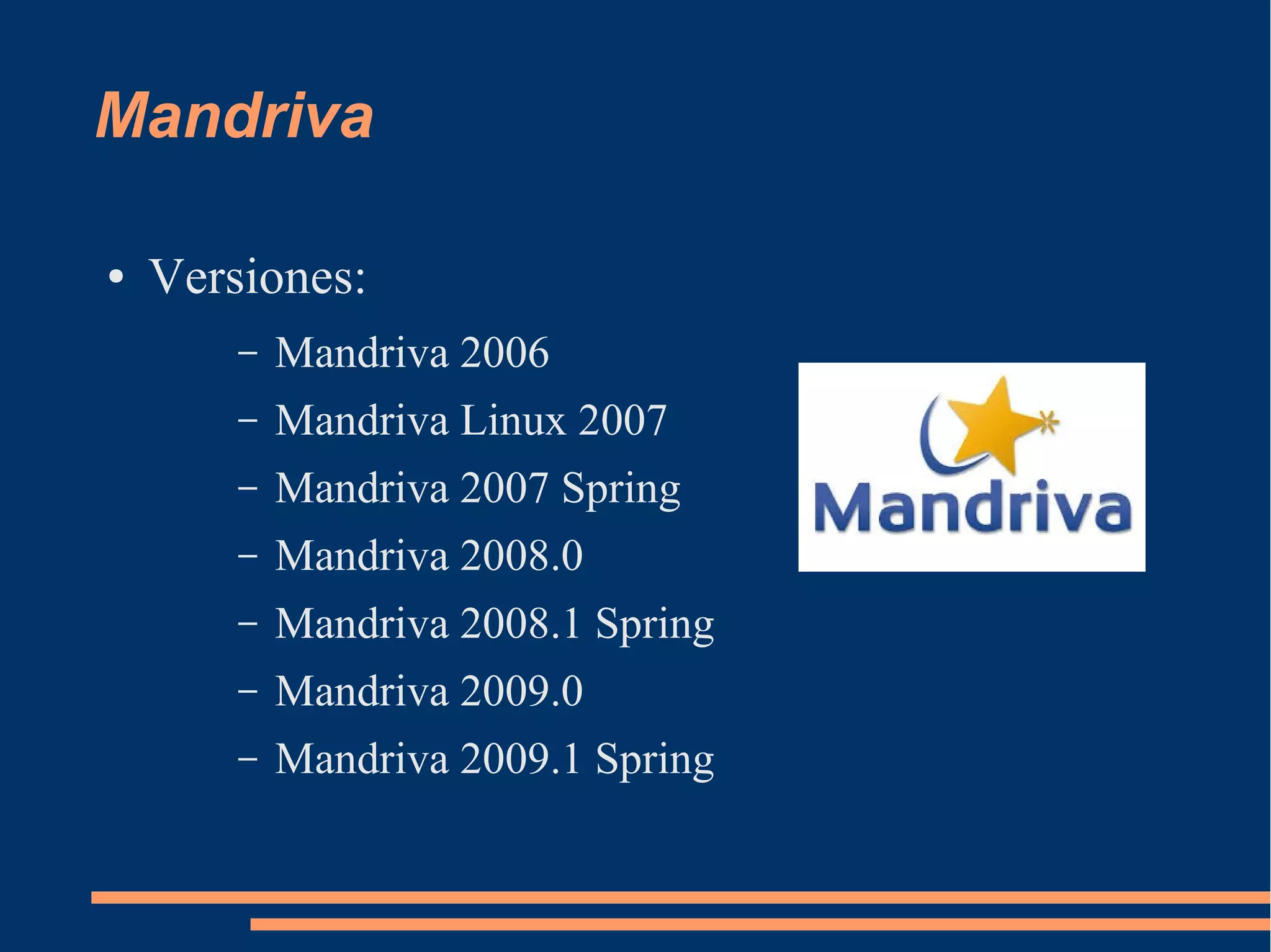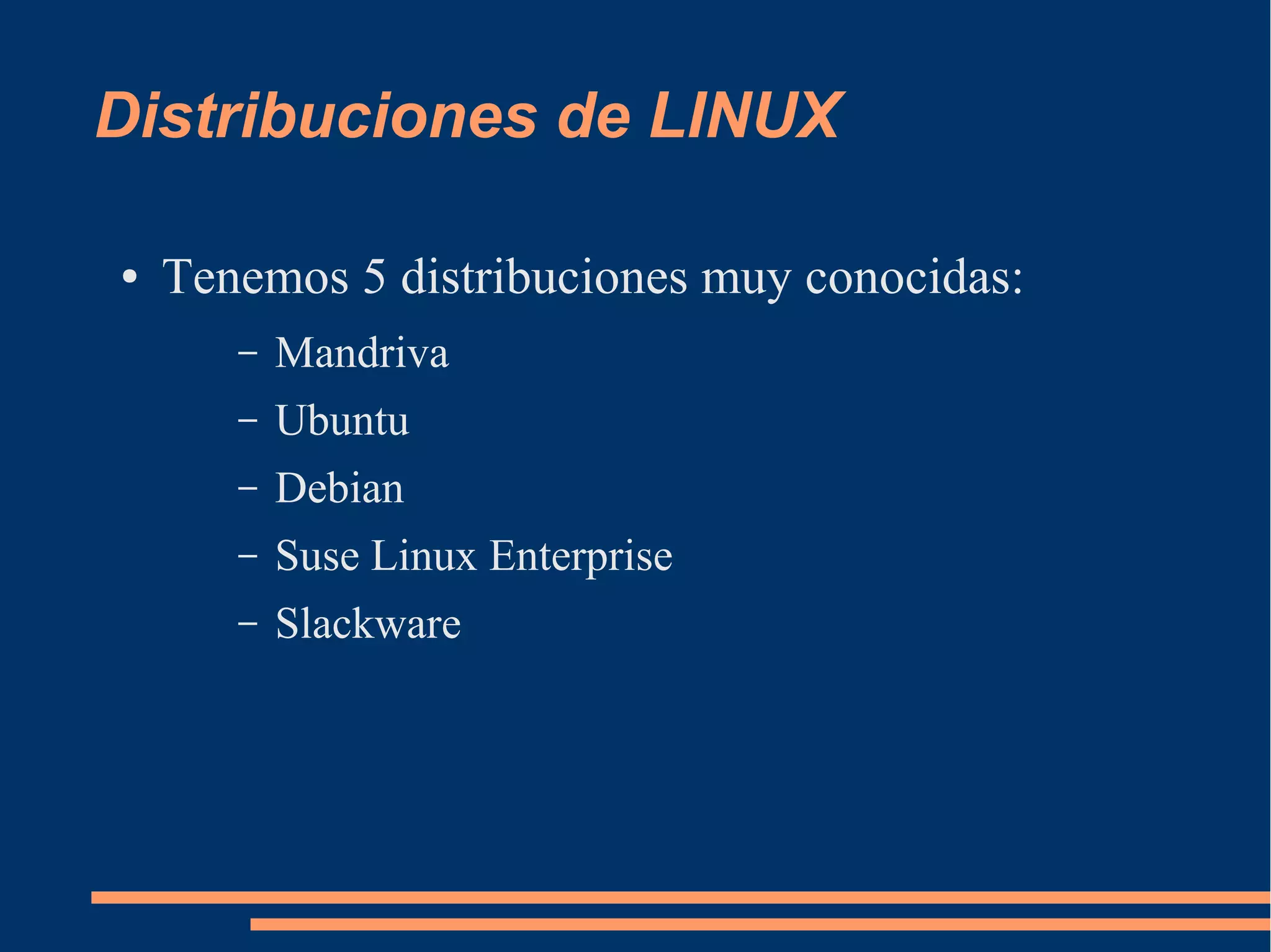 Este documento describe las principales distribuciones de Linux, incluyendo Mandriva, Ubuntu, Debian, Suse Linux Enterprise y Slackware. Proporciona detalles sobre sus versiones más recientes y características clave como el soporte de hardware, actualizaciones de paquetes a través de repositorios y traducciones a múltiples idiomas.