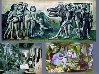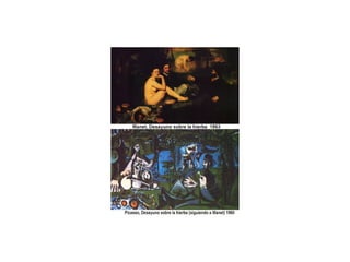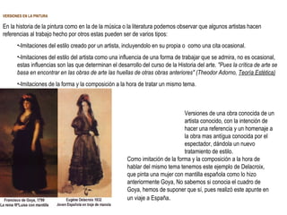 El documento describe diferentes tipos de versiones de obras de arte, incluyendo imitaciones de estilo, tema o composición. Explica que algunos artistas hacen versiones de obras famosas como homenaje y para darles un nuevo tratamiento de estilo, dando como ejemplo las múltiples versiones que Picasso hizo de Las Meninas de Velázquez. También menciona versiones críticas que artistas como Equipo Crónica hicieron de la misma obra para criticar el sistema político español bajo Franco.