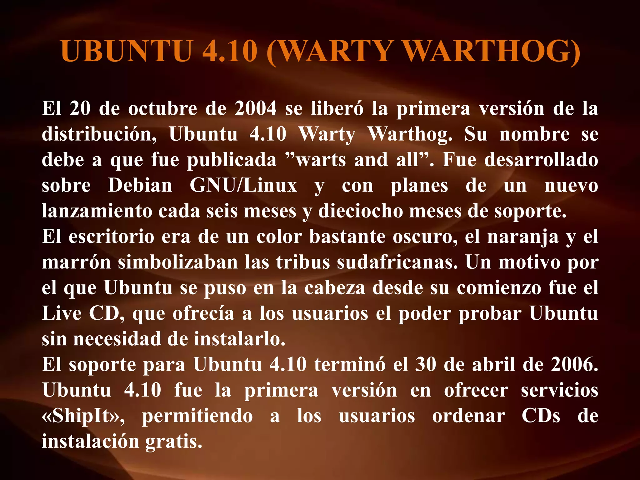 Este documento resume las principales versiones de Ubuntu desde la 4.10 hasta la 10.10, destacando las novedades y mejoras incorporadas en cada una de ellas como nuevas características, aplicaciones, componentes gráficos y cambios en el ciclo de lanzamientos.
