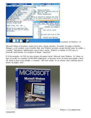 Este documento resume la historia de Microsoft Windows desde su fundación en 1975 hasta 2013. Resume que en 1975, Bill Gates y Paul Allen fundaron Microsoft con la visión de tener una computadora en cada escritorio. Luego describe brevemente el lanzamiento de cada versión importante de Windows, incluidos Windows 1.0 en 1985, Windows 95 en 1995 que introdujo Internet Explorer, y Windows 8 en 2012 que presentó una nueva interfaz de inicio con mosaicos.