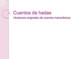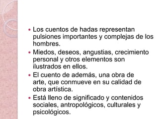 El documento resume los orígenes y significados simbólicos de tres cuentos de hadas populares: Caperucita Roja, Cenicienta y Blancanieves. Explora las versiones originales de las historias y cómo han evolucionado, además de analizar los símbolos y temas presentes como el crecimiento, las relaciones familiares y la sexualidad.