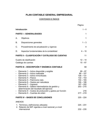 Este documento presenta el Plan Contable General Empresarial (PCGE) de Perú. Se divide en cuatro partes y dos anexos. La Parte I contiene los objetivos del PCGE, las disposiciones generales para su uso, y los aspectos fundamentales de la contabilidad. La Parte II incluye la clasificación y catálogo de cuentas. La Parte III describe cada cuenta y su dinámica. La Parte IV presenta las bases de conclusiones. Los anexos contienen definiciones y términos utilizados, y la relación de Normas Intern