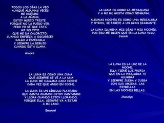 Los poemas describen a la luna y al sol de diferentes maneras. La luna se describe como una medialuna, un diamante o un círculo plateado que ilumina las noches. El sol se describe como una estrella anaranjada que brilla durante el día y llena de calor aunque a veces se enoja cuando el cielo se oscurece. Ambos son fuentes de luz que proveen compañía.