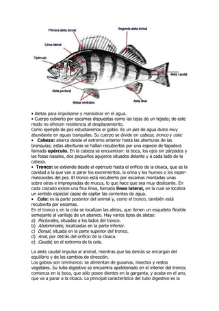 Este documento describe las características de los vertebrados y proporciona detalles sobre los peces. Explica que los vertebrados se diferencian de los invertebrados por poseer un esqueleto interno y un sistema nervioso más complejo. Luego, se enfoca en los peces y describe sus características como cuerpo hidrodinámico, escamas, aletas y más. Usa el gobio como ejemplo y explica su anatomía externa e interna, incluidos los órganos y sistemas respiratorio y circulatorio.