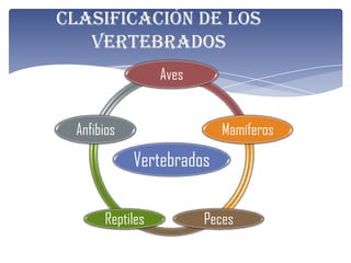 Este documento resume la clasificación de los vertebrados, con un enfoque en aves y mamíferos. Los divide en aves (clasificadas según su desplazamiento y hábitat) y mamíferos (clasificados en monotremas, marsupiales y placentarios). También describe brevemente las características y adaptaciones clave de estas subdivisiones, como las adaptaciones óseas de las aves voladoras y nadadoras.